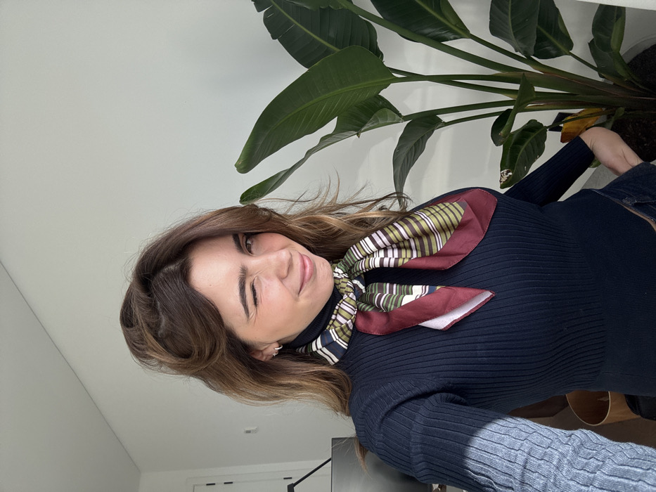 This image depicts an indoor scene in Torres Vedras, Portugal, featuring a single female subject. The woman, appearing to be in her twenties or thirties, has light brown hair styled with volume, prominent eyebrows, and is winking her right eye while smiling faintly with closed lips. She is wearing small silver hoop earrings. Her attire consists of a dark navy blue ribbed turtleneck sweater and a square silk scarf tied around her neck, featuring a striped pattern in shades of dark navy, white, light green, olive green, and maroon, with solid maroon sections. Her left arm is partially visible, showing a lighter blue ribbed sleeve, likely part of a separate garment or a layered effect. To the subject's right, a large potted plant with broad, dark green leaves, resembling a Bird of Paradise plant (Strelitzia), is visible. The background consists of a plain white wall, suggesting a minimalist interior. Natural light illuminates the scene, casting subtle shadows.