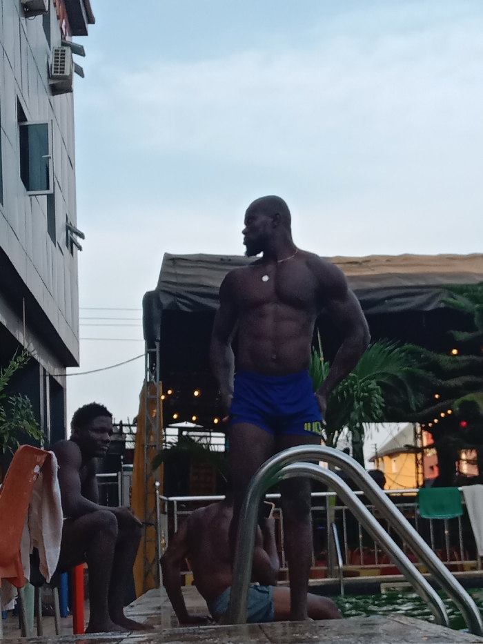 Three shirtless, dark-skinned men are positioned near a swimming pool. One is standing, wearing blue shorts, displaying a muscular physique. Another man sits on a chair with a towel draped nearby. A third man appears to be either sitting or lying at the pool's edge. Poolside rails are visible in the foreground. A building, a dark tent or canopy, and some greenery, including a palm tree, are visible in the background. The sky is overcast.