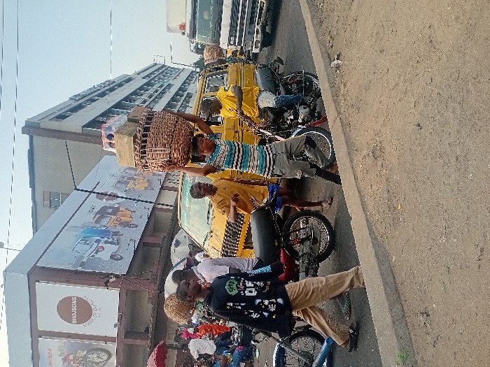 A bustling street scene captures several individuals in motion. One person carries a large basket on their head, while others are seated on or next to motorcycles. A yellow vehicle is visible, adding to the vibrant urban environment. Billboards and a multi-story building stand as background elements. The image conveys a sense of daily life and commercial activity.