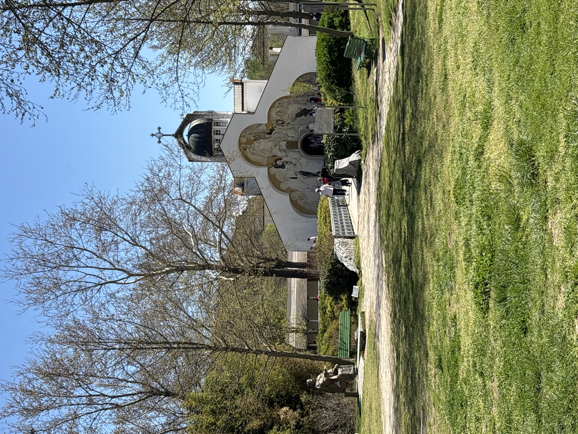 The image depicts a church in General Todorov, Bulgaria. The church has a white facade adorned with religious murals above the entrance. A black dome with a cross sits atop the structure. A paved path runs along the right side of the frame, bordered by green grass. Trees with bare branches frame the top and left of the image, against a clear blue sky. Several people are visible near the church entrance. A green bench sits along the path.