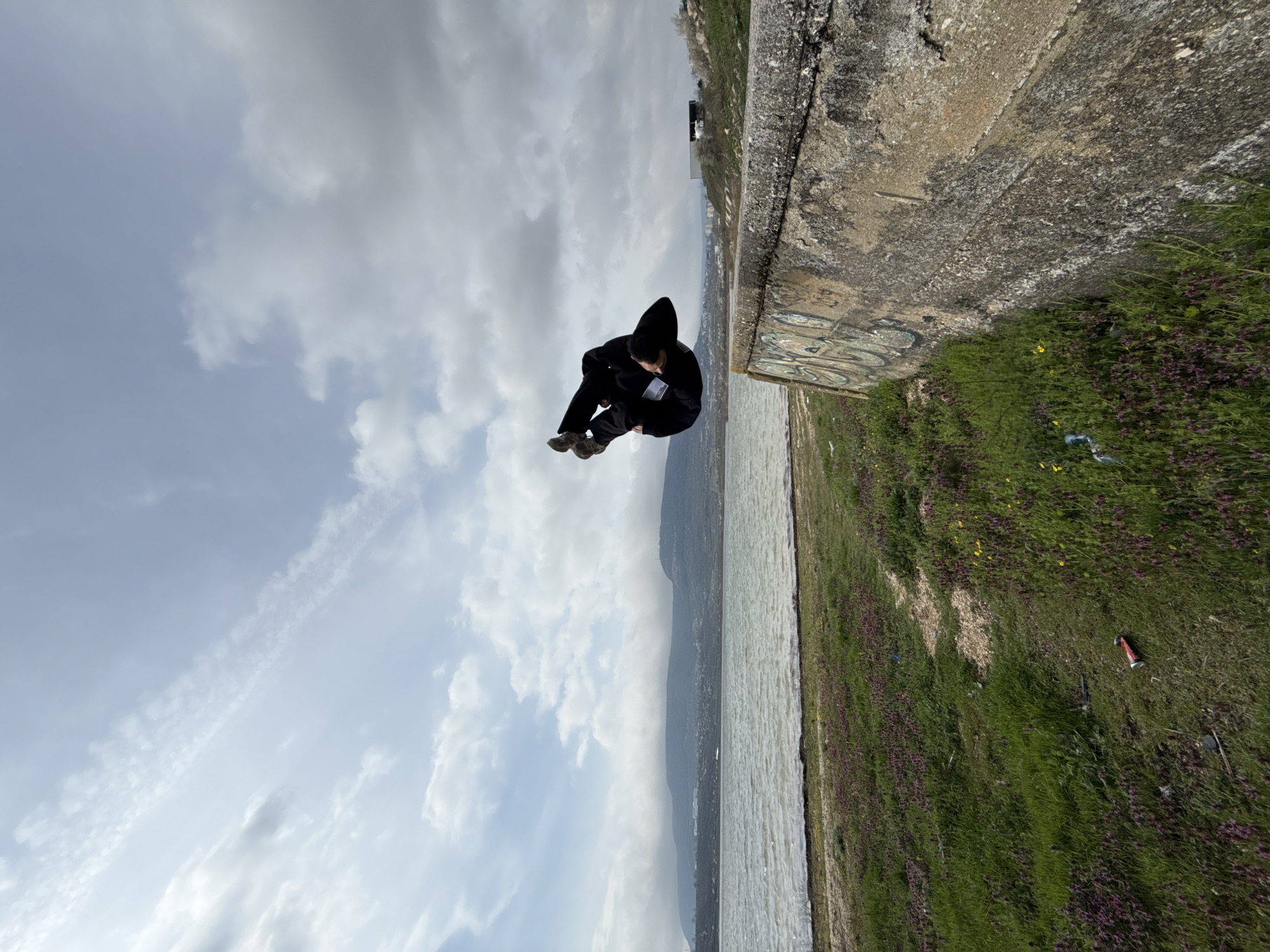 A person dressed in black clothing is sitting on a concrete wall. Beneath the wall is a green grassy field with a body of water beyond. The sky overhead is filled with clouds. The location is Shumen, Bulgaria.