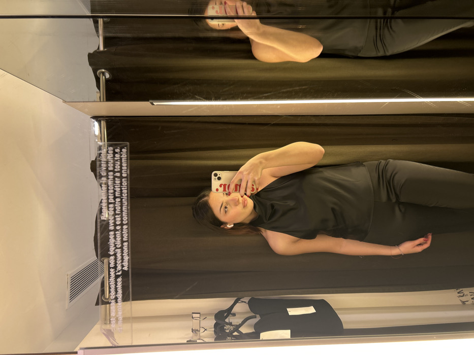 A young adult female is depicted taking a selfie in a fitting room mirror within a retail clothing store in Strasbourg, France
