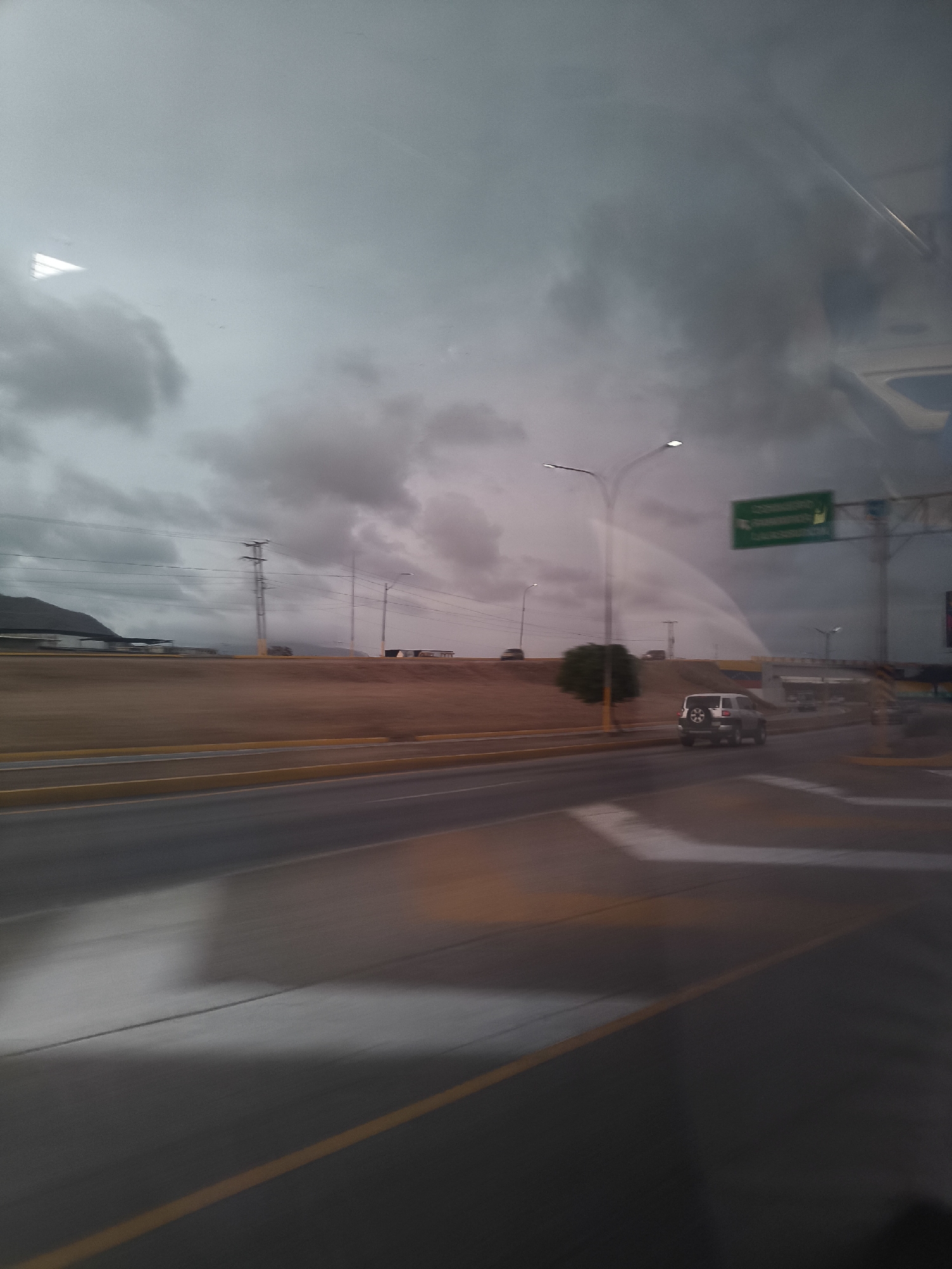 The image displays a multi-lane asphalt highway or major road in El Piache, Venezuela, viewed from the interior of a moving vehicle, as evidenced by reflections across the foreground