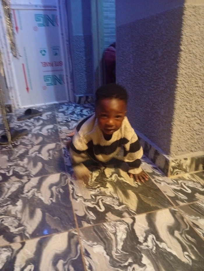 A young child crawls on a patterned tile floor wearing a black and white striped sweater. The child faces the viewer with a slight smile. Behind the child, there is a doorway and wall textures. A pair of sandals sits near a white panel with red arrows and "NG" text. The lighting is dim, casting shadows across the room.