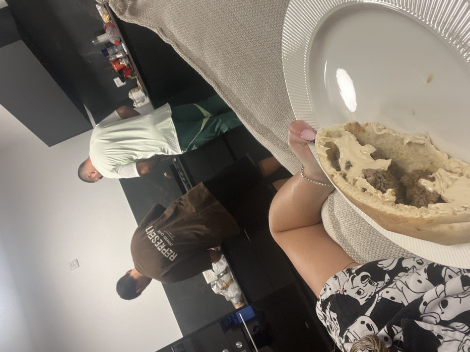 This image depicts an indoor scene within a modern kitchen and living area located in Petah Tikva, Israel. In the foreground, a person is seated on a light-colored, upholstered couch, with their bare legs visible. They are wearing black and white patterned shorts, and an ankle bracelet is present on the right ankle. The person's hand, displaying light pink nail polish, holds a white oval plate featuring a half-eaten pita bread filled with meatballs and a light-colored sauce, possibly tahini. In the midground and background, two adult males are observed standing in a kitchen with dark-colored cabinets and countertops. The male on the left wears a brown t-shirt with "REPRESENT OWNERS CLUB" text and black shorts, and is positioned over a counter area where several white food containers are visible. The male on the right wears a light green t-shirt and dark green athletic pants with light green accents, and is occupied at a different section of the counter or stove, with various kitchen items and bottles arranged nearby. A dark range hood is situated above the cooking area. The walls above the dark backsplash are white, and a single electrical outlet is visible. Both males have their backs largely turned to the viewer, indicating they are actively engaged in food preparation within the kitchen space.