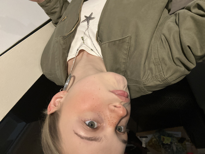 A person with fair skin and freckles poses for a selfie. They have light eyes, blonde hair, and a small nose ring. They wear a white t-shirt adorned with a starfish and layered necklaces. An olive green jacket is draped over their shoulders. A large, elongated silver earring hangs from their left ear. The background is dark, with a glimpse of a cluttered area to the bottom right. The image is tilted.