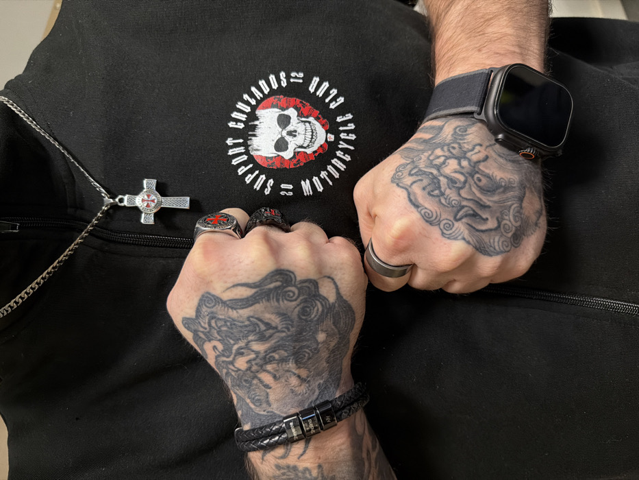 The scene depicts a close-up of an individual's upper torso and hands, situated in the city of Grevenmacher, Luxembourg. The subject, a male, is wearing a black zippered jacket. On the left chest area, a white embroidered circular logo reads "SUPPORT CRUZADOS 2012 MOTORCYCLE CLUB" encircling a white skull with red accents. A silver-colored chain necklace with a textured Maltese cross pendant, featuring a red and white central emblem, hangs from the neck. Both of the subject's hands are clenched into fists and are heavily tattooed with intricate grey-scale designs across the knuckles and dorsum. The right hand (viewer's left) wears a multi-strand black braided leather bracelet adorned with four metallic cylindrical beads engraved with names: "Sheyenne," "Shalina," "Abby," and a fourth partially obscured name. A silver-colored ring with a red central emblem is present on the right middle finger, and another dark-colored ring is on the right ring finger. The left hand (viewer's right) displays a dark grey or black ring on the ring finger and a black smartwatch with a black strap on the wrist. The background behind the subject is indistinct and dark.