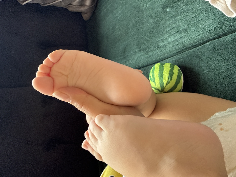 A close-up, indoor shot captures an adult's hand gently touching the sole of an infant's left foot