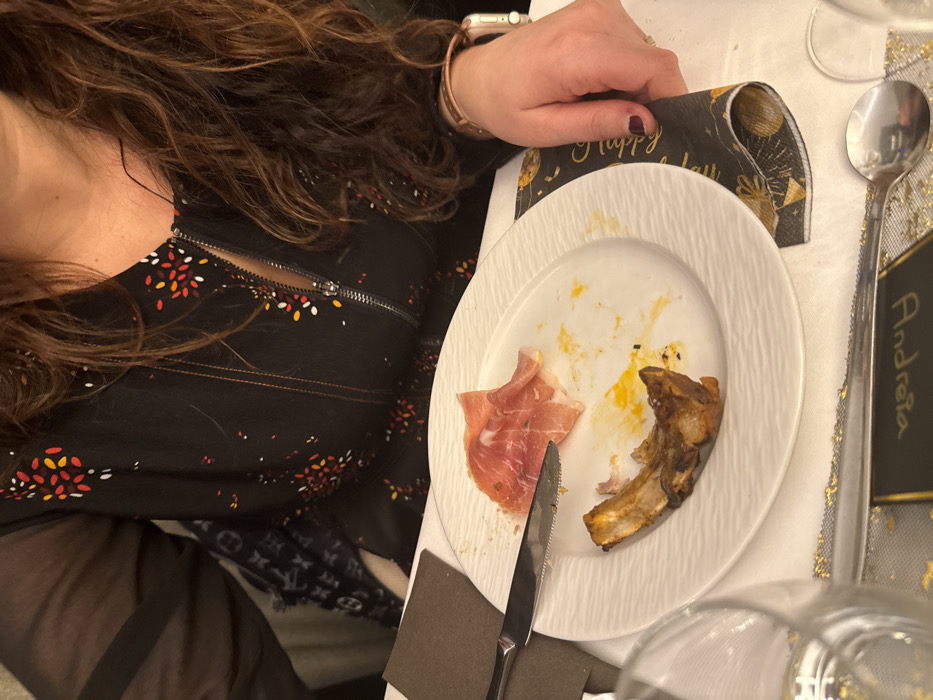 A partial view of a woman at a dining table. She has long brown hair and wears a black top with a zippered front and patterned design. On the table is a white plate with remnants of a meal: ham, a bone, and sauce. A knife rests on the plate. A dark napkin and a spoon are beside the plate. A name card is visible, and she wears a smartwatch on her wrist.
