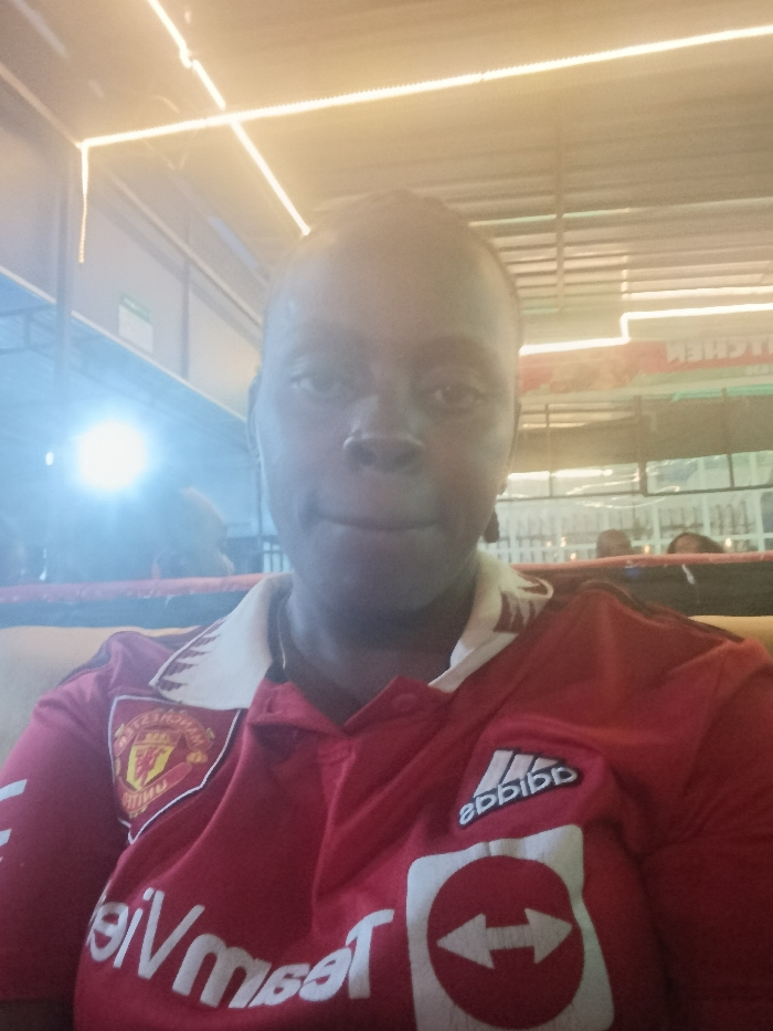A person in a red Manchester United soccer jersey is seen from the chest up. The jersey has white trim on the collar and sleeves, the Adidas logo, and a logo with two arrows facing opposite directions. They are indoors with bright lights above, and other people can be seen in the background.