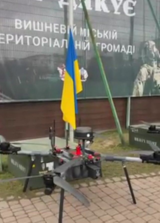 two large drones on the ground next to a Ukrainian flag. They both have eight propellers and are labeled "Heavy Shot". Behind them is a banner in Ukrainian, and a fence. The drones are stationary and there are no people visible in the frame. The environment appears to be an outdoor area, possibly a display or demonstration. The surface is paved with brown and gray bricks.