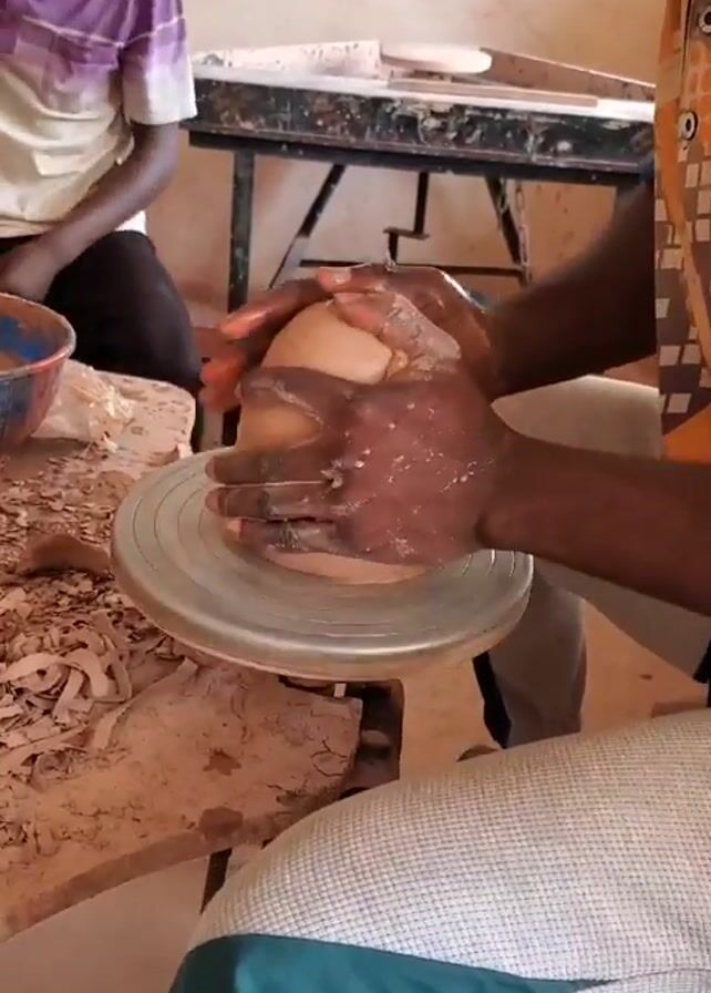 In an indoor shot, a man in a patterned shirt sits at a table and uses his hands to shape a lump of clay spinning on a pottery wheel. The man's hands are covered in wet clay. There's a plastic bowl and wooden shavings on the table beside the wheel. Another man in a purple shirt is bent over working in the background. A black metal table and a whiteboard are also visible in the background.