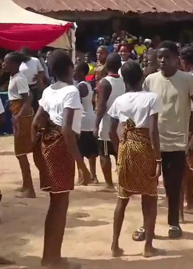 A group of young people are performing a traditional dance in an outdoor setting. They are wearing white t-shirts and patterned skirts. They move in a circle, stepping rhythmically. A crowd of people surrounds the dancers, watching the performance. A white tent with red trim is visible in the background, along with a few buildings. The ground is sandy and there are scattered trees in the distance. Some of the t-shirts have lettering on the back. A woman stands off to the side, holding a white plastic bag.