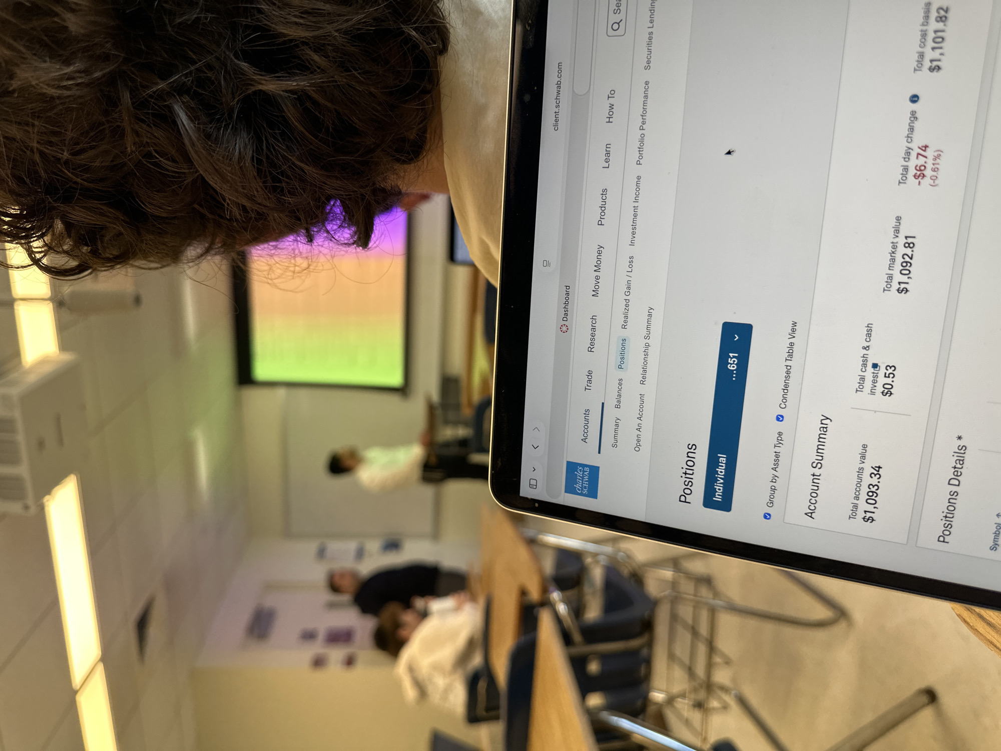A person sits in a classroom in the city of New York, United States of America, looking at a laptop displaying a Charles Schwab account summary