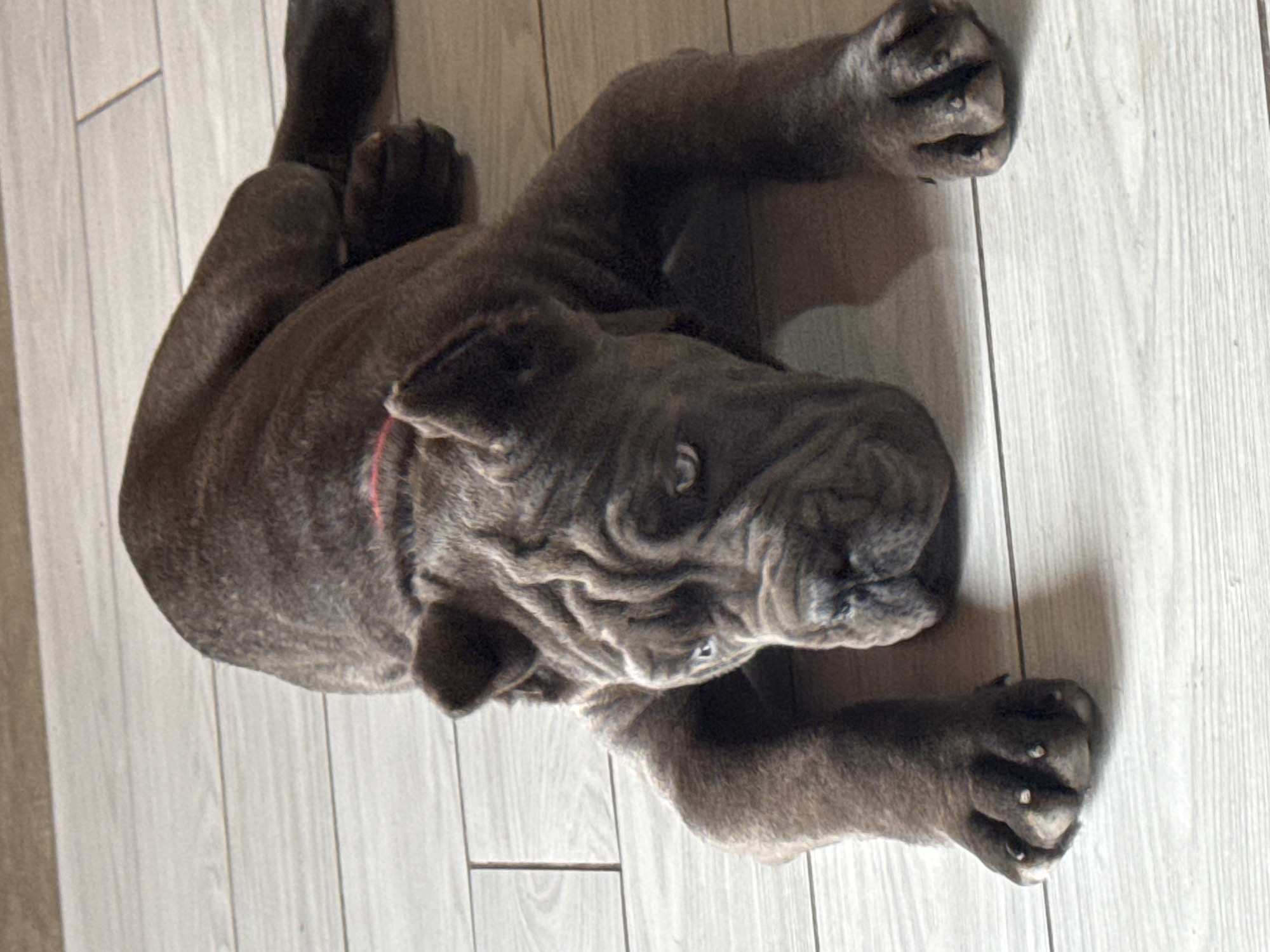 grey puppy lying on a light-colored wooden floor. The puppy is positioned with its head toward the bottom right corner of the frame and its body angled diagonally towards the top left. The puppy's face is wrinkly, and its eyes are partially visible. A red collar is around its neck. Its legs are extended, with paws facing outwards. The location is indoors and the city is Unknown, Unknown.