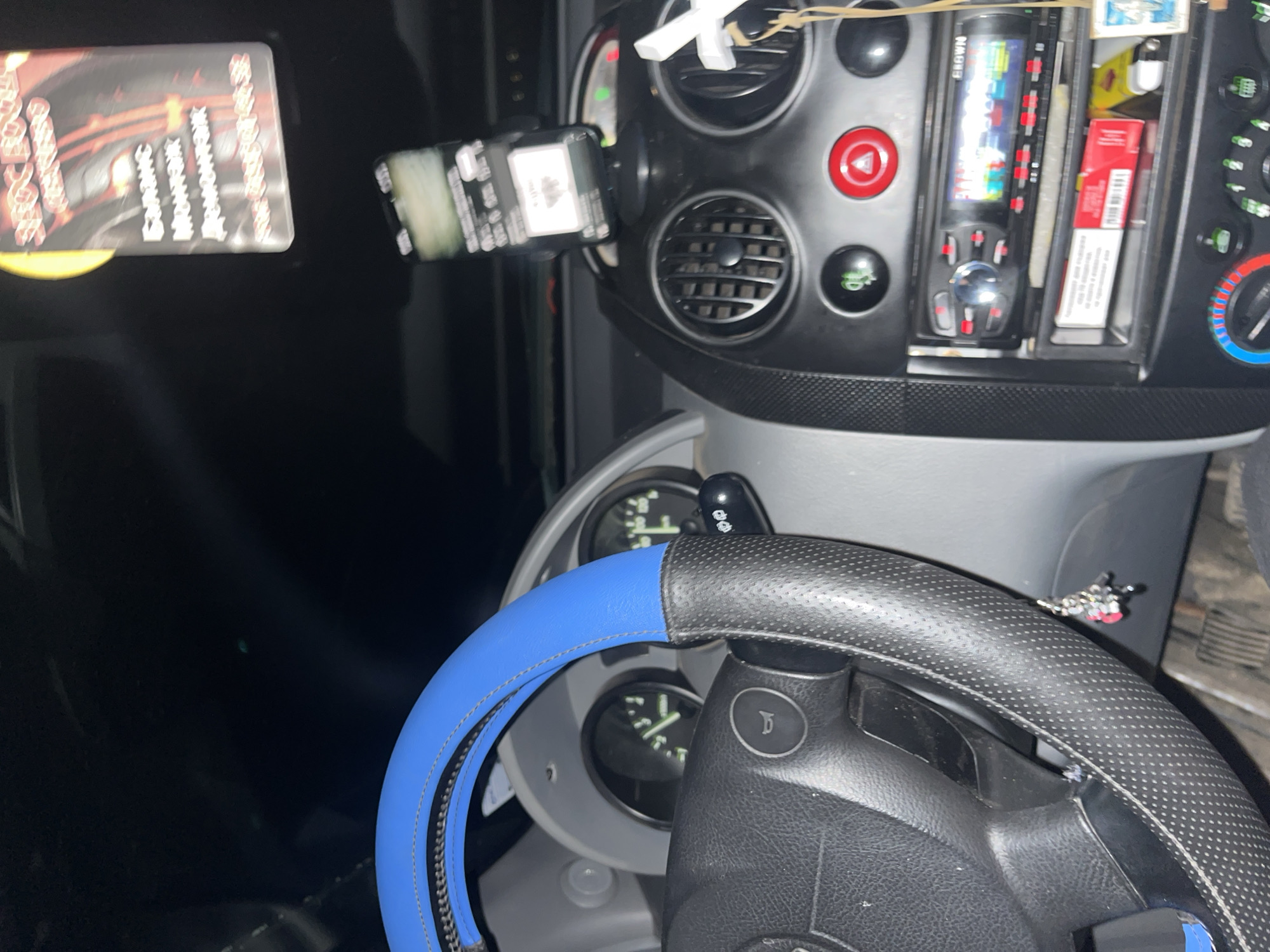 interior of a car. A steering wheel with a blue cover is in the foreground, partially obscuring the dashboard. The dashboard includes air vents, a radio/media player with a colorful display, and some buttons. A pack of cigarettes is visible in a storage space on the dashboard. A mobile phone is mounted to the left of the vents. The environment outside of the car appears to be dark. The location is unknown and is not determinable from the image. The location is not necessarily in Skravena, Bulgaria. No people are visible. No interaction is visible.