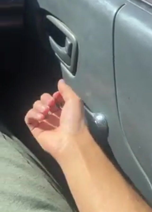 person cranking a manual car window open. The person is wearing a green shirt, and the car's interior is a worn gray color. The camera is positioned inside the car, focused on the door and the person's hand. Outside the window, a landscape of reddish-brown desert or rocky terrain is visible. The car is in motion.