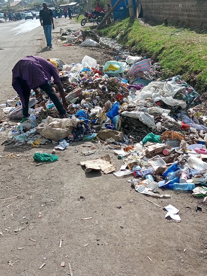 The image depicts a roadside scene in Nairobi, Kenya, characterized by a large, uncontained accumulation of mixed refuse along a dirt shoulder