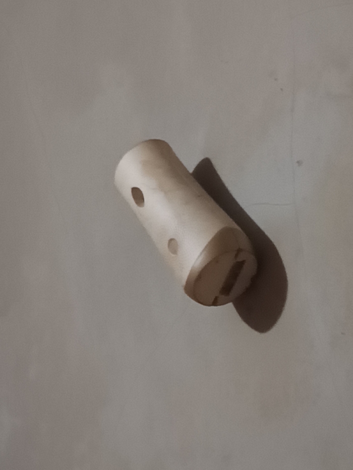 A small, cylindrical, light-brown wooden object sits diagonally against a mottled, pale-grey background. The object has two small, dark, circular holes on its side. One end has a darker-brown cap-like structure with a rectangular slot in its center. A distinct shadow of the object is cast on the background.