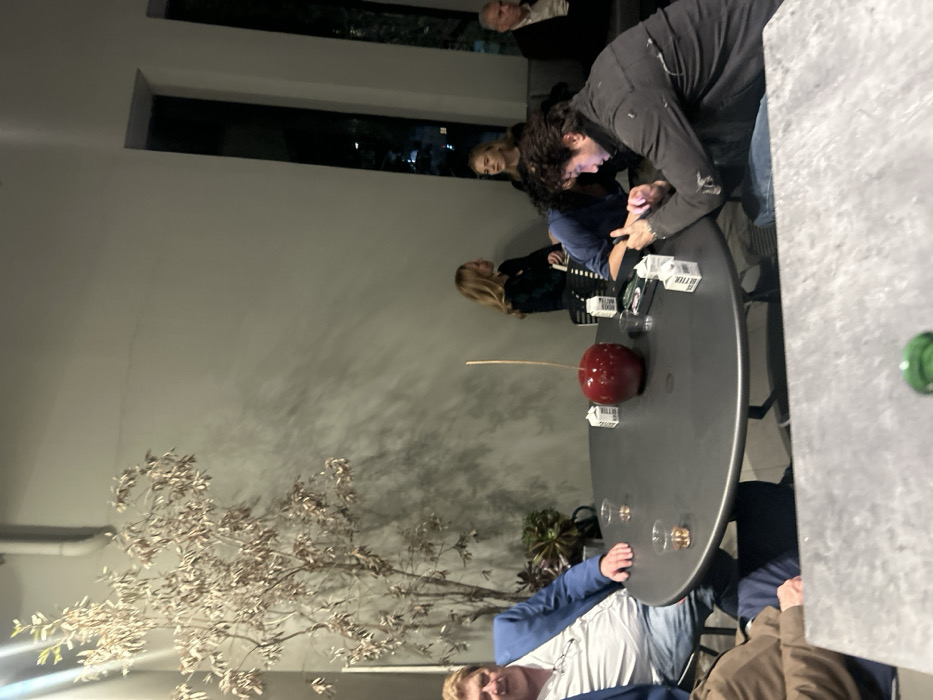 A group of people gathers around a round table indoors. A man in a blue jacket sits at the table's edge, while others stand or sit nearby. A large, decorative red cherry sits in the table's center, surrounded by what appears to be beverage cartons. A tree-like decoration stands near the table, and outside, a window reveals a nighttime cityscape. Several individuals are engaged in conversation.