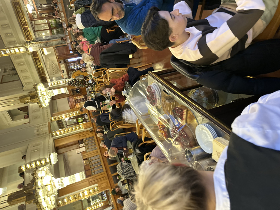 The image captures the interior of Kavárna Slavia, a grand café located in Prague, Czechia. The scene is bustling with multiple patrons distributed across the large hall, characterized by high ceilings, ornate plasterwork, numerous multi-tiered chandeliers, and extensive dark wood paneling with gilded accents. In the immediate foreground, a person with short, light-colored hair, wearing a white collared shirt and black vest, stands with their back to the viewer, positioned next to a counter. On this counter, a stack of white plates and a metal pitcher are visible. Adjacent to the counter is a glass display case containing several whole cakes and pastries, including fruit tarts and layered cakes. To the right, a young male with short dark hair, wearing a horizontally striped pink and brown long-sleeved shirt, is seated at a table, looking downwards and to his right. His dark jacket is draped over the chair. Further to the right, an adult male with dark, receding hair and a beard, wearing a blue knitted sweater, sits at a table, looking intently to his left. In the mid-ground, slightly left of center, a young East Asian female in a reddish-brown long-sleeved top is seated at a table, holding a white smartphone horizontally, aiming it into the room as if taking a photograph. A white teacup and saucer are on her table. Various other individuals, predominantly adults, occupy tables throughout the café, some conversing, others observing. A male server in a white shirt and dark vest is visible in the background attending to patrons. A small, illuminated Christmas tree stands against a far wall. Several people are also visible on an upper balcony level, observing the lower floor. The lighting is bright, illuminating the ornate interior and the many occupants.