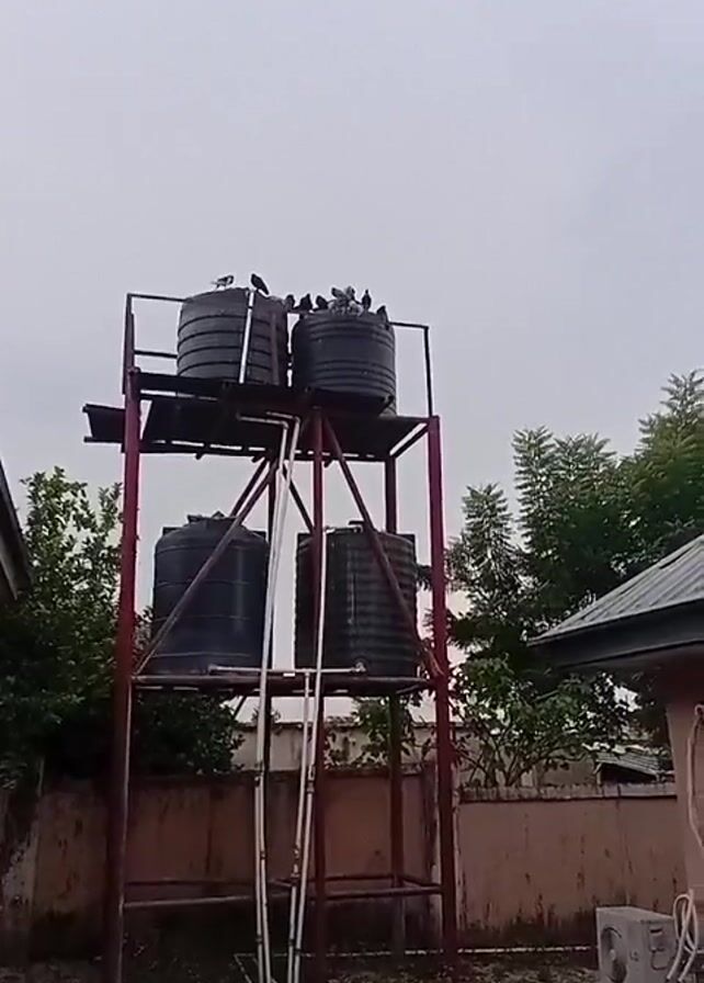 two-tiered water tank structure, holding four black water tanks. A ladder is leaning against the structure. A group of birds are perched on top of the upper water tanks. The structure is located in a backyard or outdoor area, with trees and buildings visible in the background. The sky is overcast. An LG air conditioning unit is visible near the bottom-right of the frame.
