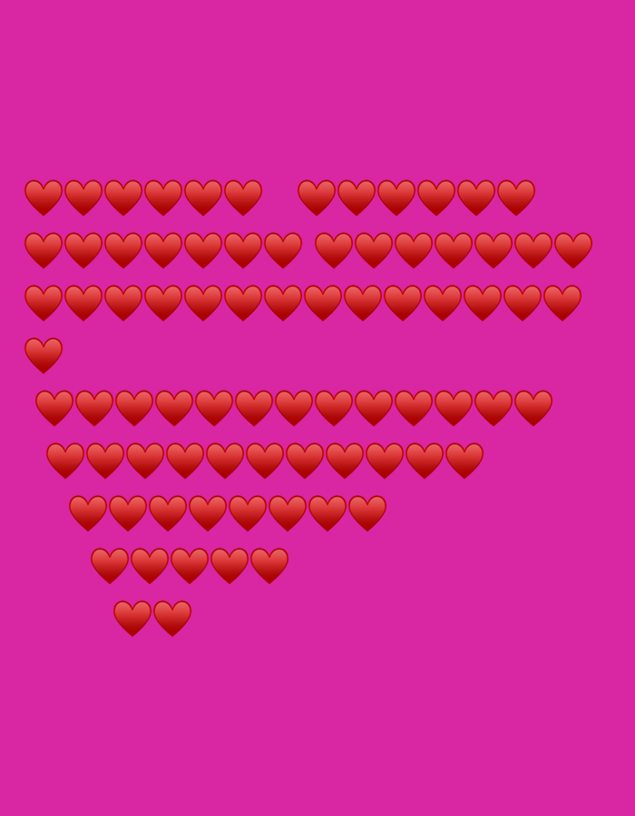 The scene is a digital image featuring a solid magenta background. Red heart emojis, each exhibiting a subtle gradient, are arranged in a multi-row block formation positioned in the upper-left and central areas. The heart arrangement spans ten distinct rows, with approximate counts from top to bottom as follows: 12, 12, 13, 13, 12, 12, 12, 10, 6, and 2 hearts. No individuals, additional objects, actions, or interactions are present. The location is Unknown, Unknown.