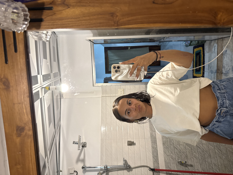 An adult female is depicted taking a mirror selfie in a bathroom located in the city of Nilwella, Sri Lanka