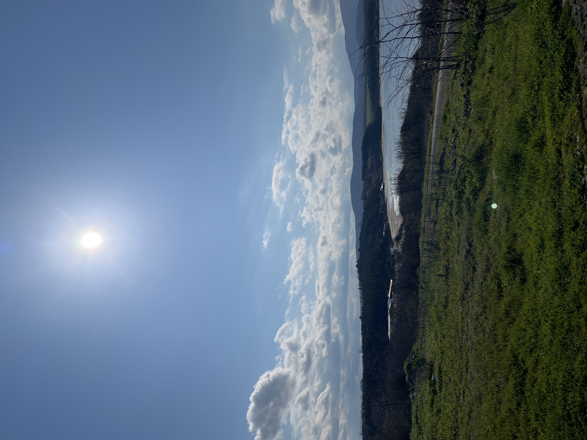 The image depicts a landscape in Ahtopol, Bulgaria. The view is from a grassy area, overlooking a coastline with a beach and water. Beyond the water, there's a line of hills or mountains visible in the distance. The sky is blue with scattered white clouds and a bright sun. There's a small road and some sparse vegetation between the grassy area and the beach. No people or interactions are visible in the image.