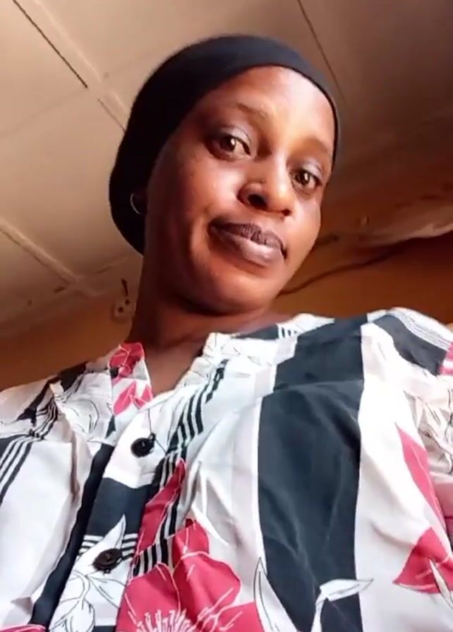 A woman with a black head wrap poses for a close-up video inside a building with a white paneled ceiling