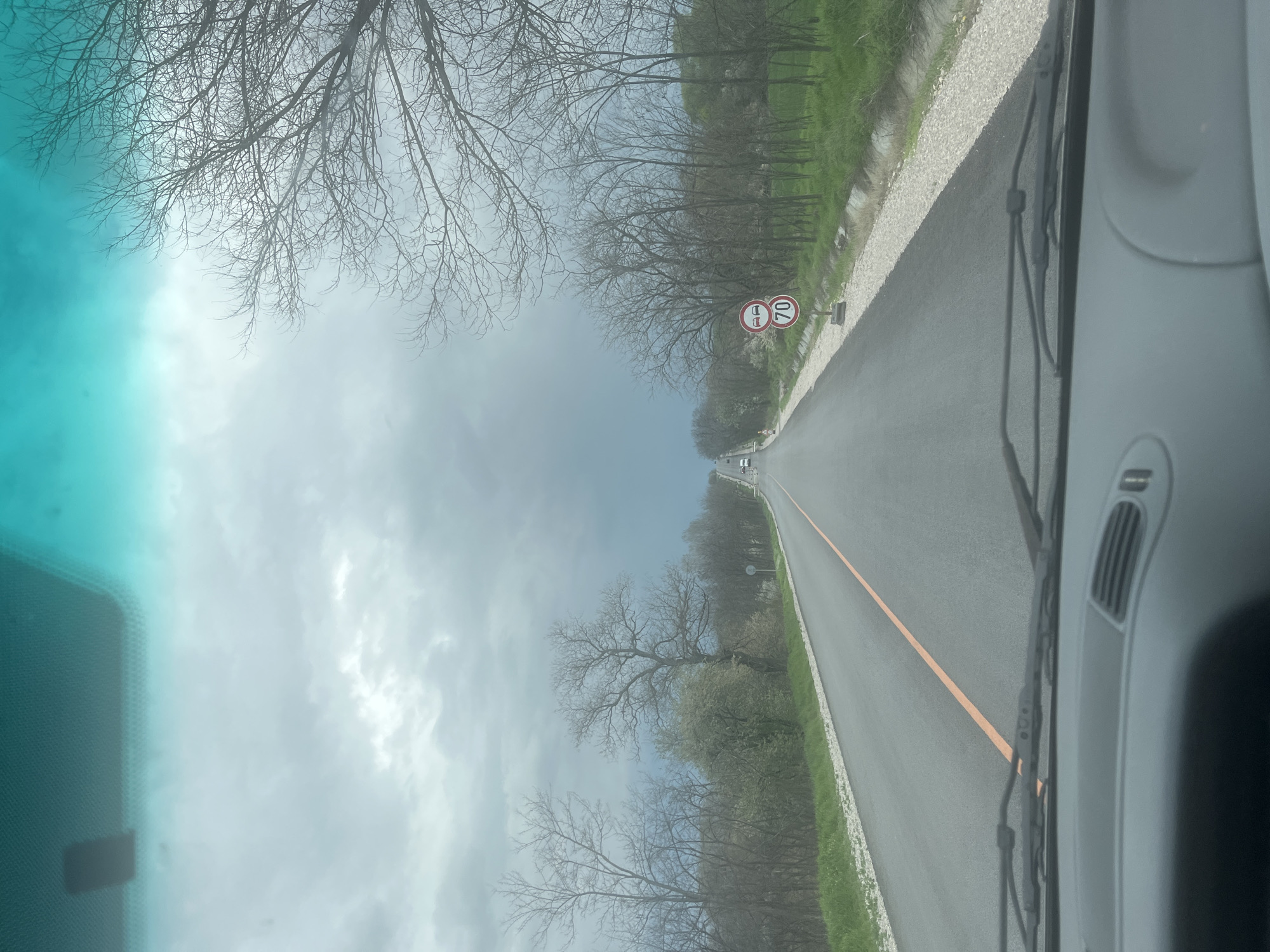 The image, taken from inside a vehicle, shows a road stretching into the distance