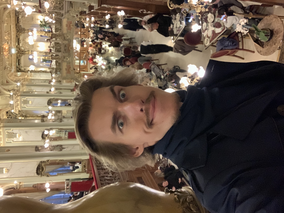 The image depicts a male subject taking a selfie inside the New York Cafe in Budapest, Hungary