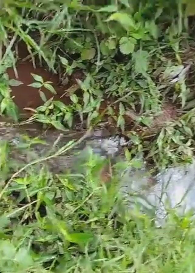 small stream with green vegetation along its banks. The water is murky and brown. A small, rustic bridge made of logs and mud spans the stream. On the other side of the stream is a field of crops. The camera pans to show the length of the stream and the bridge.