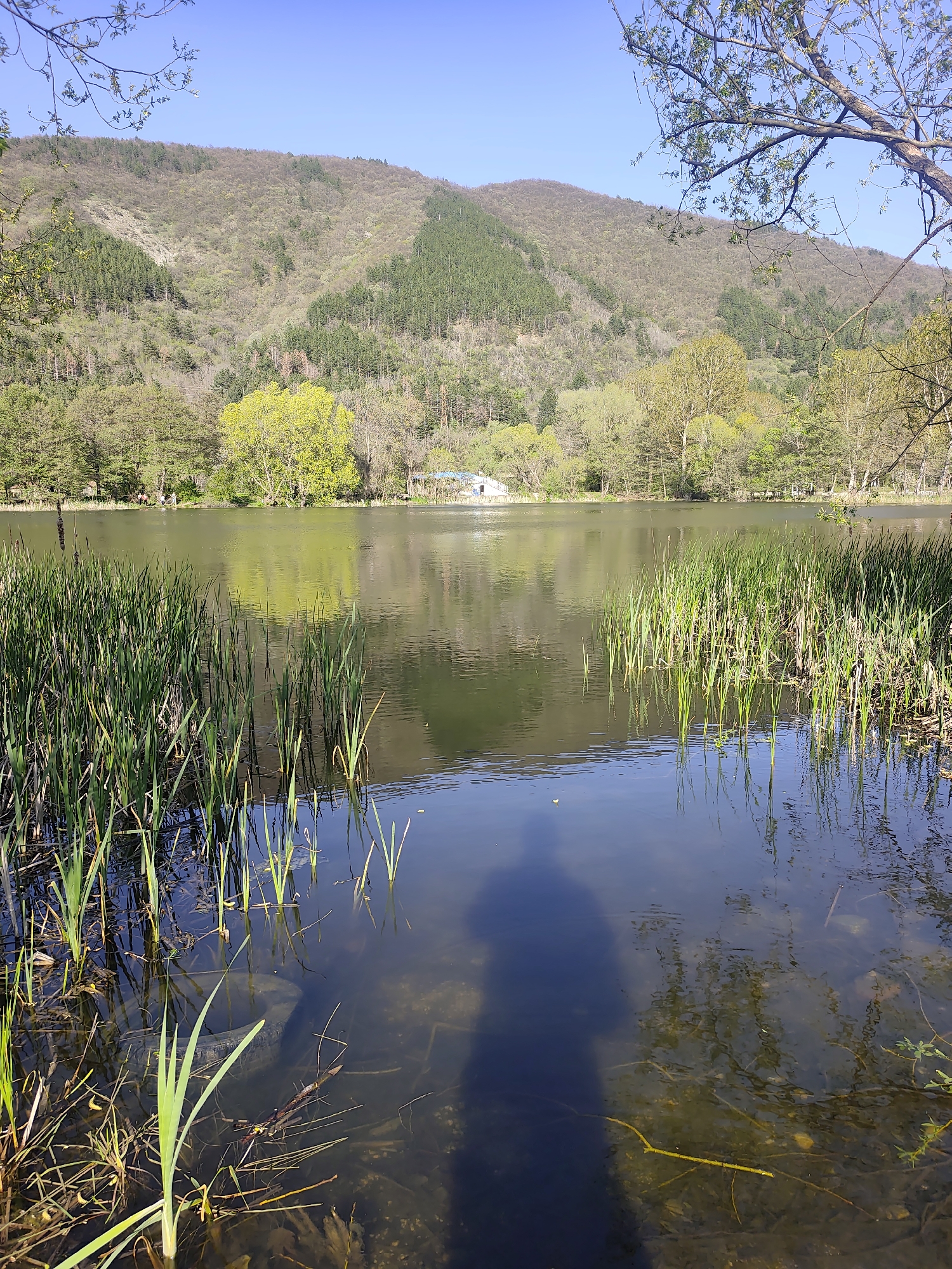 lake in Kokalyane, Bulgaria, with a mountain in the background. The lake is surrounded by trees and vegetation, including tall grasses growing in the water near the shore. A building is visible on the far side of the lake. The water appears somewhat clear, with a dark, blurry, human-like silhouette reflected on the surface. The sky is blue.