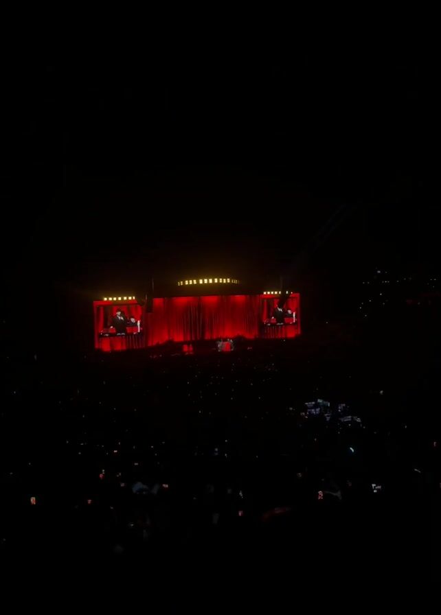 concert stage with red curtains. A man wearing a black coat and hat is speaking into a microphone. Behind him is a pianist, also wearing a black hat. Other musicians are visible in the background. The stage is lit with red and yellow lights. The audience is visible, holding up their phones to record the performance.