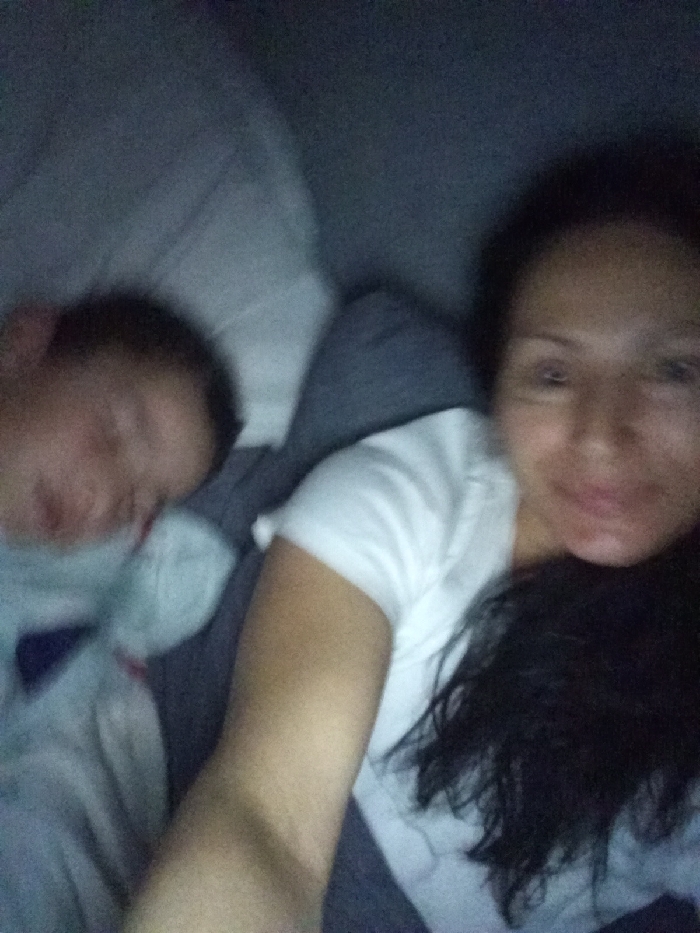 The image, taken in Benkovski, Bulgaria, depicts two individuals in a low-light, interior environment, consistent with a bedroom setting. On the left side of the frame, a young individual, likely a child, is observed lying down with their eyes closed, indicating sleep or unconsciousness. This individual's head and upper body are partially obscured by light-colored, possibly white or light blue, bedding or apparel. To the right, an adult female is positioned, partially visible from the chest up. She wears a white t-shirt and has long, dark hair spread around her head. Her face, though blurry, is oriented towards the camera, exhibiting a subtle expression that could be interpreted as a faint smile. Her right arm extends towards the lower center of the frame. The background and surrounding areas consist of dark, indistinct fabric, suggestive of bedding or upholstery in hues of grey and blue. The overall image exhibits significant blur, characteristic of low-light photography or camera movement.