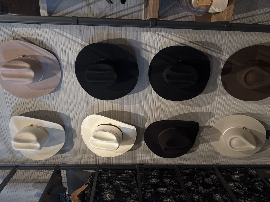 The image displays an interior retail setting in San Antonio, United States; the specific location is not discernible. Eight hats are mounted on a light-colored wall featuring horizontal grooved textures. The hats are arranged in four rows, two columns, from top to bottom, left to right: 1. A white felt cowboy hat and a light beige felt cowboy hat. 2. A white woven straw cowboy hat with a dark hatband, and a black wide-brimmed felt hat. 3. A dark brown felt cowboy hat, and a second black wide-brimmed felt hat. 4. A light beige felt cowboy hat, and a dark brown felt hat. Each hat is displayed with its crown facing outwards, casting shadows on the wall. To the left, a black metal clothing rack holds dark-colored, patterned garments on wooden hangers. To the right, a section of a black metal shelving unit is visible, with a wooden shelf holding at least one light-colored cap featuring an orange rectangular patch. No people are visible in the scene.