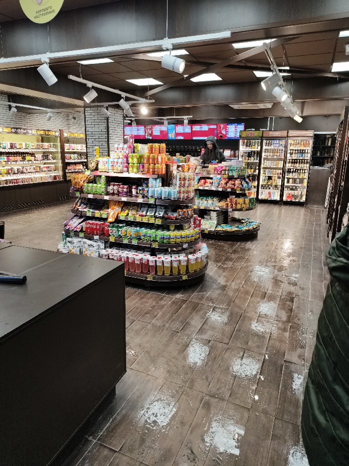A retail space features a brown tiled floor with scattered white splotches, giving a distressed or wet appearance. Aisles display various snacks and drinks on tiered shelves. A person stands near one of the displays, partially obscured. Refrigerated cases line the back walls, filled with beverages. Overhead lighting fixtures illuminate the area. A dark-colored counter is partially visible.