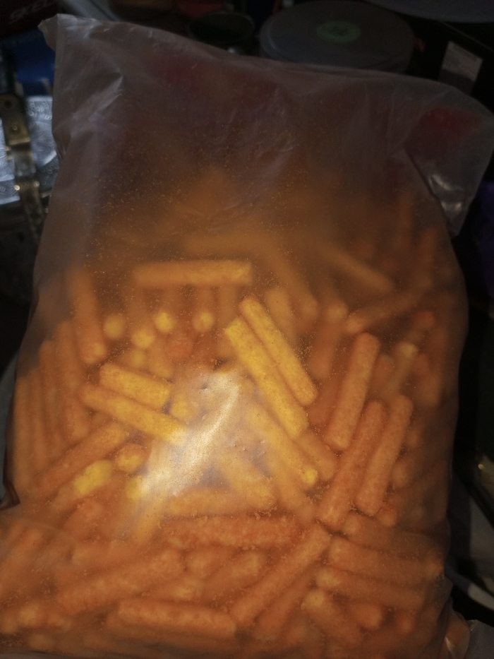 - "A large, transparent plastic bag is filled with orange-colored, stick-shaped snacks" by FM-4YnJo2, licensed under CC BY 4.0