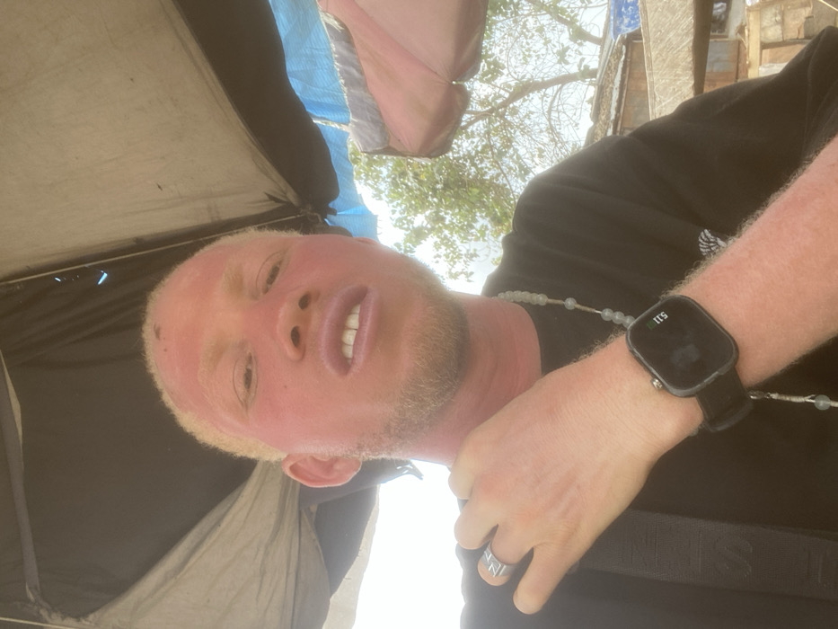 A male individual with albinism is depicted in a close-up, likely a selfie, in an outdoor setting in Onitsha, Nigeria. He has fair skin with a reddish tone on his face and neck, light blond hair, and a light beard. His lips are light pink, and his upper teeth are slightly visible as his mouth is partially open. He wears a dark-colored t-shirt. On his left ring finger is a silver-toned ring with an angular "N" or similar symbol. A black smartwatch displaying "5:11" is on his left wrist. A light-colored beaded necklace with cylindrical metallic spacers is visible around his neck. His right arm is bent, with fingers resting near his neck/shoulder area. Overhead, a beige or light brown tarp provides partial shade. In the mid-ground, green tree foliage is visible against a bright, hazy sky. The lower right background shows rudimentary structures made of corrugated metal and wood, consistent with market stalls or informal buildings typical of urban environments in Onitsha.