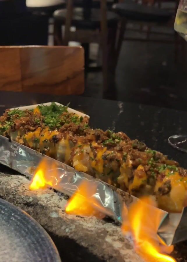 plate of sushi rolls being flambéed at a restaurant
