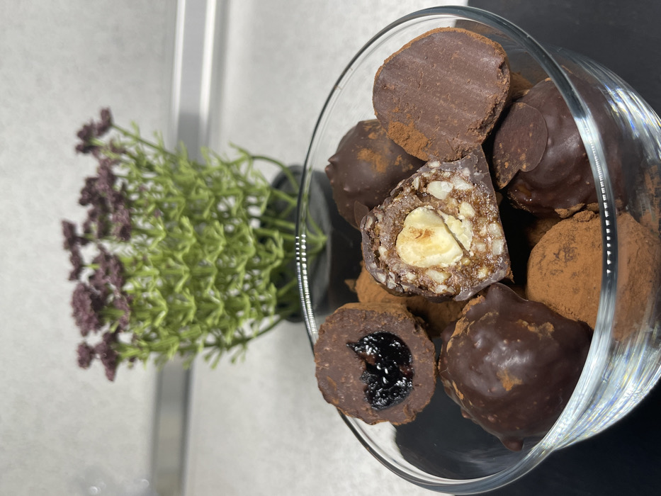The scene depicts an indoor setting, identified as a location in Burgas, Bulgaria. A clear, round glass bowl is positioned centrally on a dark, flat surface, likely a countertop or placemat. The bowl is filled with approximately ten dark brown, spherical or irregularly shaped chocolate confections. Two of these confections are cut in half, revealing their interiors. One bisection exposes a dark, viscous filling, consistent with a fruit preserve or jelly. The other bisection displays a textured, light brown core composed of chopped nuts, with a single, whole, light-colored hazelnut prominently embedded in the center. Several other confections are coated in smooth, dark chocolate, some with slight textural variations, while others are dusted with a fine layer of cocoa powder. In the blurred background, an artificial plant with green stems and small, purple-brown floral clusters is visible within a black pot. The background wall or surface is light gray, featuring a horizontal light-colored line or edge. No individuals are present, and no active interactions are depicted.