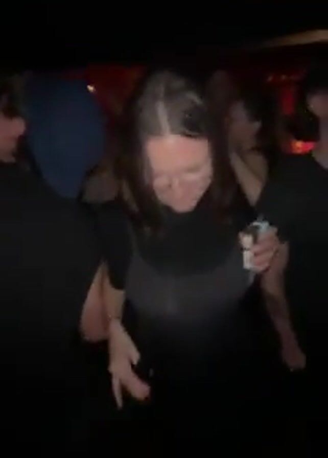 dimly lit dance floor in a club or party setting. People are dancing to music, their movements indistinct due to the low light. A woman in glasses and a dark outfit holds a bottle and seems to be enjoying herself, while a man in a white shirt is also dancing. The background features a red light source.