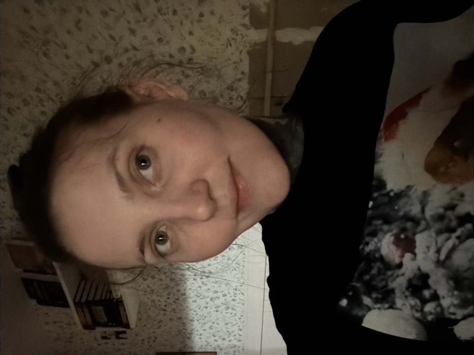 A woman poses for a selfie, her face tilted toward the camera. She has fair skin, light brown hair, and olive-green eyes, with a slight smile. She wears a black top with an image printed on it. The background includes floral wallpaper, a bookshelf with books, and a partially obscured light-colored wall with vertical elements.