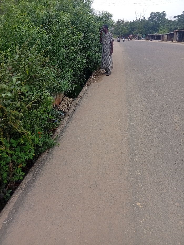 The image depicts an outdoor scene in the city of Ozuri, Nigeria, focused on a paved road and adjacent vegetation. In the foreground-midground, an adult male, dark-skinned, stands on the edge of the asphalt road, positioned to the right of a dense wall of green foliage. He is wearing a full-length, vertically striped, light-colored garment and dark sandals. His right hand is raised towards his mouth area, obscuring the precise object or action, but suggests consumption or oral engagement. To the immediate left of the man and extending towards the foreground is a thick bank of lush, green vegetation. At the base of this vegetation, bordering the road, a shallow drainage ditch or gutter is visible, containing some sparse refuse including what appears to be dried plant matter and possibly plastic debris. The road itself is a two-lane asphalt surface, appearing dry and in moderate condition, extending diagonally from the lower right towards the upper center and receding into the distance. In the background, on the far side of the road, several low-rise structures with corrugated iron roofs are visible, indicating buildings. Beyond these structures, additional trees and distant, indistinct figures, including what appear to be moving vehicles (possibly motorcycles), can be discerned. The sky is overcast or hazy, providing diffuse lighting. The perspective is from a low angle, looking across and along the road.