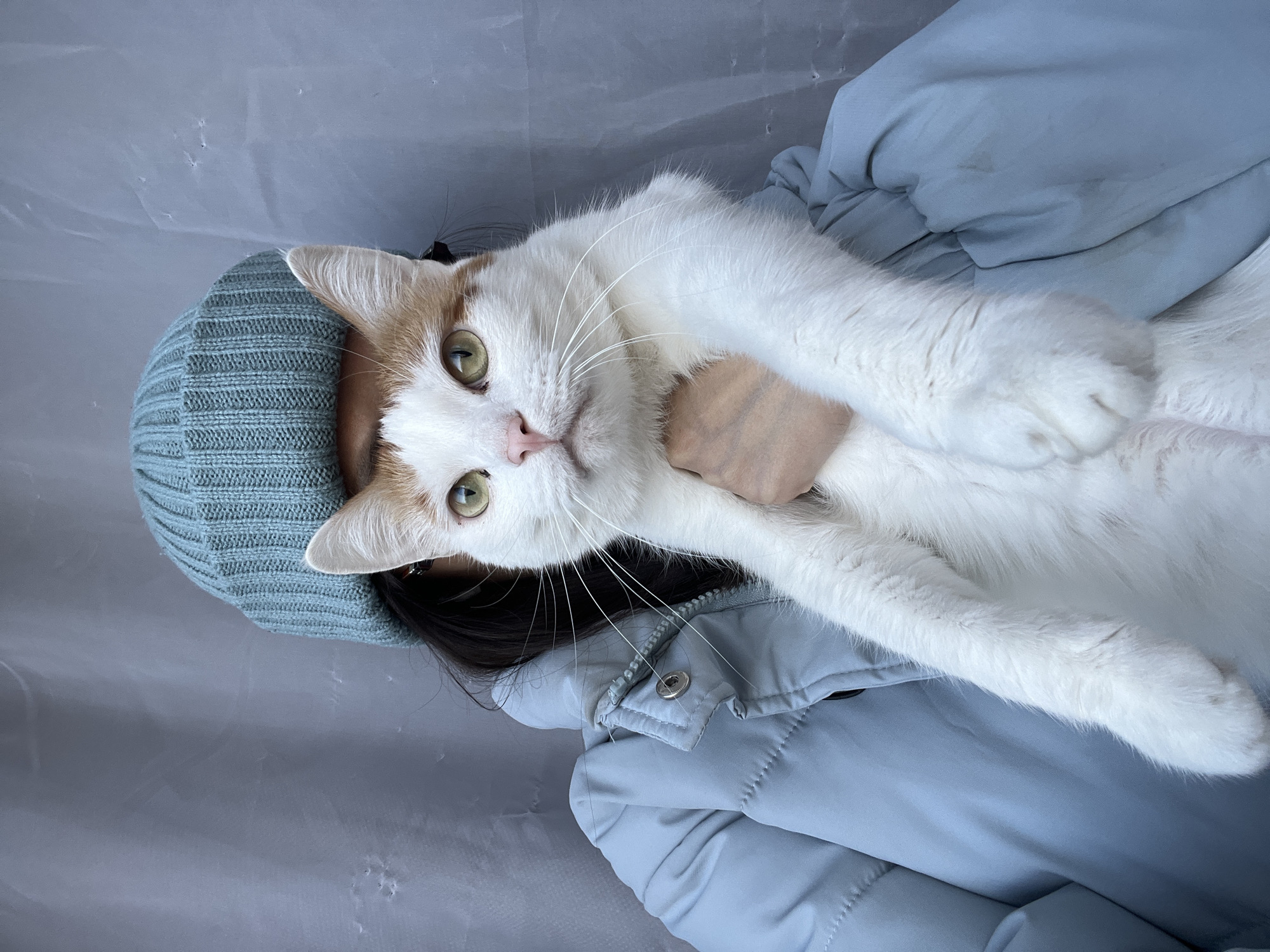 A person in a light blue knit hat and jacket is holding a white cat with orange markings on its head