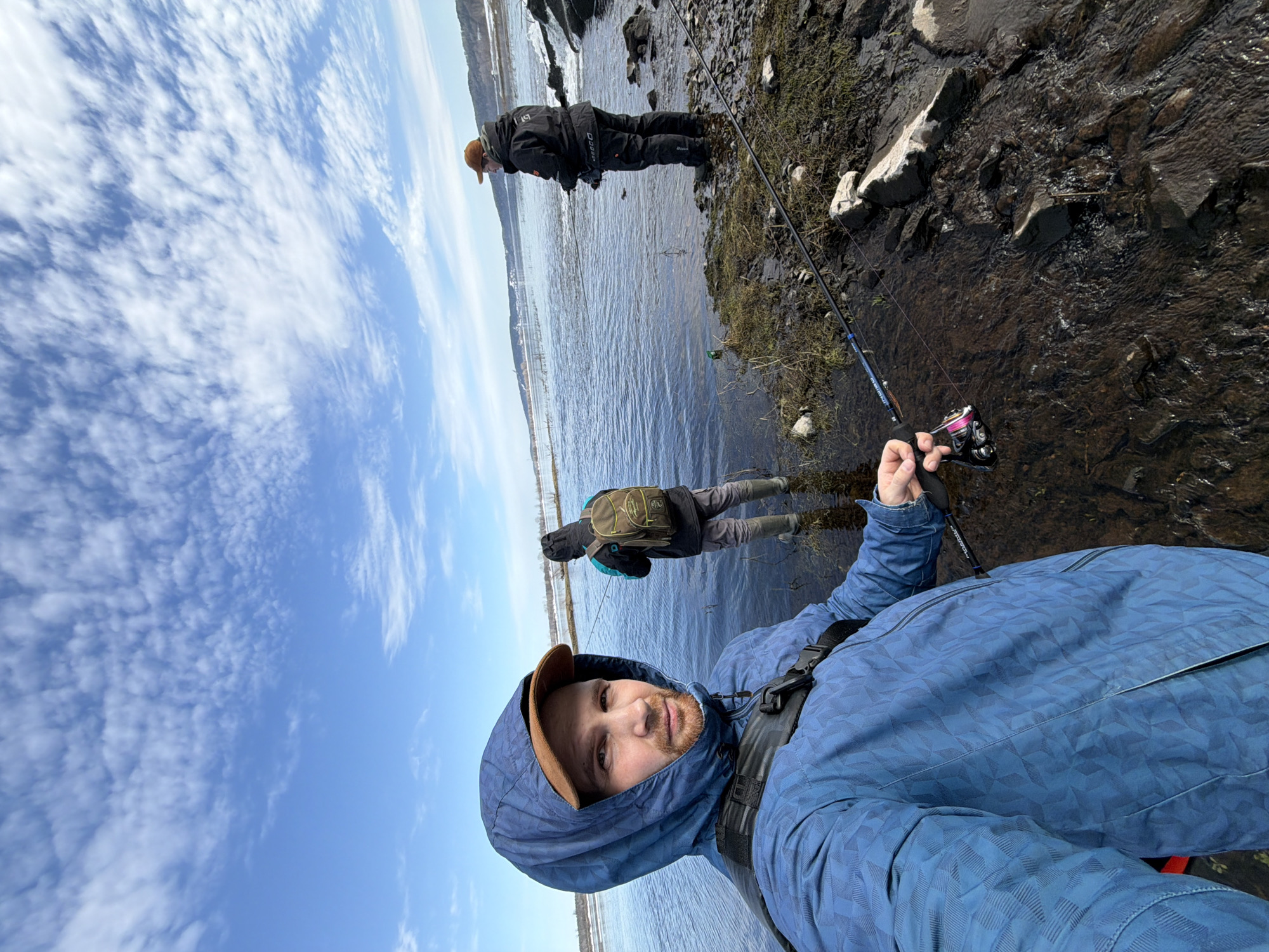 A wide-angle photograph taken at eye-level depicts three males engaged in fishing along a rocky, muddy riverbank under a bright blue sky with scattered white stratocumulus clouds. The location is the city of Unknown, Unknown. In the immediate foreground, a male with light skin, short brown hair, and a beard, wearing a blue geometric-patterned hooded jacket over an orange-brown baseball cap, captures a selfie. He holds a fishing rod with a pink and black spinning reel in his right hand, angled towards the water. A black chest harness is visible across his jacket. He stands partially submerged in shallow, dark water near the bank. Behind him, to the left, a second male stands waist-deep in the river, facing away from the camera. He wears a dark blue and turquoise hooded jacket, gray cargo pants, tall green rubber boots, and a large olive-green and black backpack. He holds a fishing rod, casting into the water. To the right, a third male stands on the rocky bank at the water's edge, wearing a dark hooded jacket, dark pants, and a brown baseball cap. He holds a fishing rod angled into an area of visibly flowing water. The river's edge is characterized by dark rocks, wet soil, and sparse, brown vegetation. The water is a deep blue-gray, extending to a distant horizon line where faint landmasses, possibly hills or mountains, are visible, some appearing barren or snow-dusted. The overall scene suggests outdoor recreational fishing in a cool-weather environment.