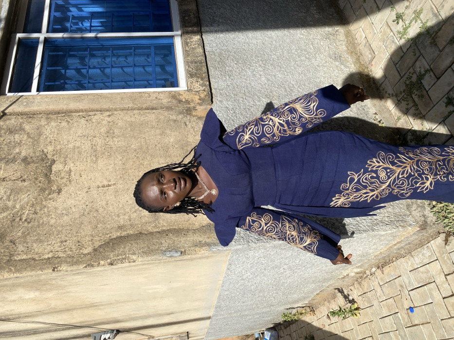 A female individual stands outdoors in Jos, Nigeria, facing slightly left and looking towards the upper right. She has dark skin and her hair is styled in dark dreadlocks or braids. She wears a dark blue, possibly floor-length, gown with structured, slightly extended shoulder elements. The gown features intricate gold embroidery in a swirling, floral pattern on the full-length sleeves and the lower front portion of the skirt. A silver-toned necklace with a central pendant and small, light-colored earrings are visible. The background consists of a building wall under direct sunlight. The upper section of the wall is textured, light brown, and appears to be concrete or stucco, showing signs of weathering. The lower section of the wall is textured grey, distinct from the upper part. On the upper right, a window with a white frame and blue-tinted glass or blue security bars is visible. An electrical box or utility fixture is mounted on the wall in the upper left. The ground is paved with light-colored interlocking bricks, with sparse green vegetation growing between them on the left side. A small blue plastic cap rests on the pavement near the base of the wall. Distinct shadows are cast on the ground and parts of the wall, indicating strong overhead lighting.
