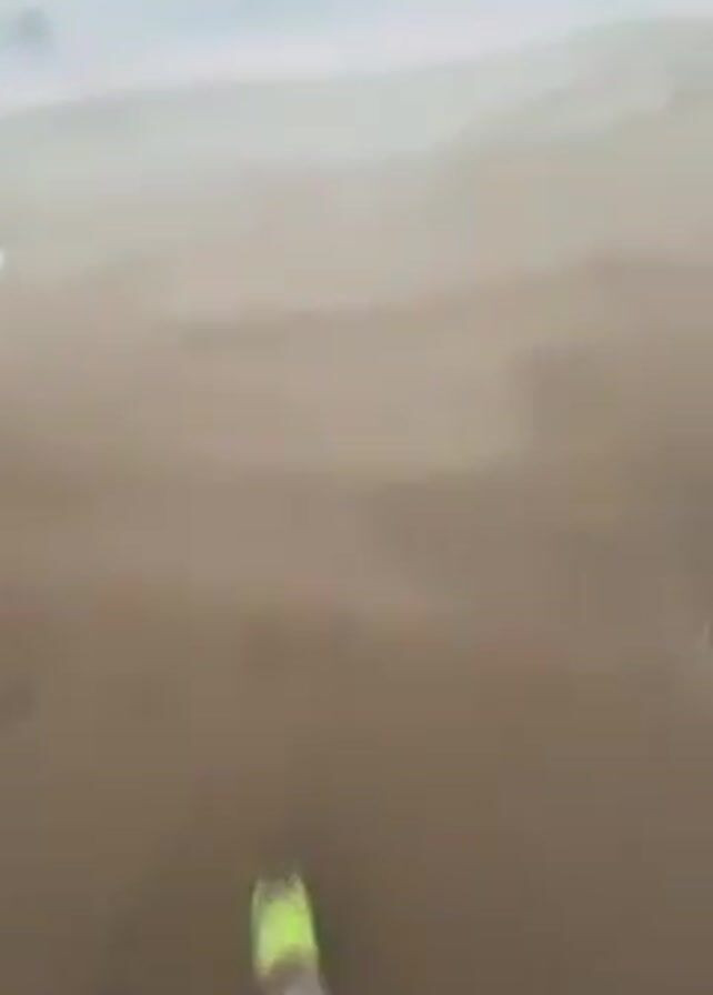 person walking on a sandy beach. Initially, the camera focuses on the person's feet, which are wearing bright green sneakers, and the sand beneath. The person is also wearing light-colored pants and a white shirt. As the camera moves upward, the scene reveals a view of the beach with the ocean in the background. The sky is a gradient of pale blue and pink, suggesting it could be sunrise or sunset. There is a pier or breakwater visible in the distance, and the water is calm with small waves. The beach appears mostly deserted except for the person walking, and there are tire tracks in the sand.