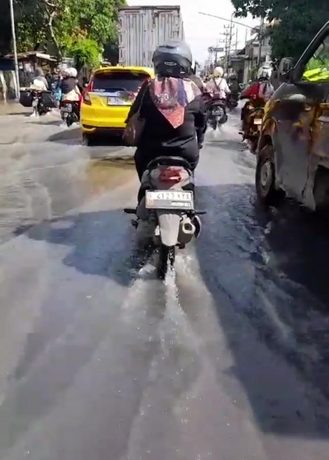 street flooded with water. Several motorcyclists, including the person recording the video, are driving through the water. A yellow car is in front of the person recording, and a large truck is further ahead. The water is splashing up as the vehicles move through it. There are trees on either side of the road, and buildings can be seen in the background. The sky is light blue.
